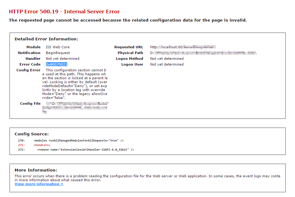 HTTP Error 500.19 - Internal Server Error 0x80070021